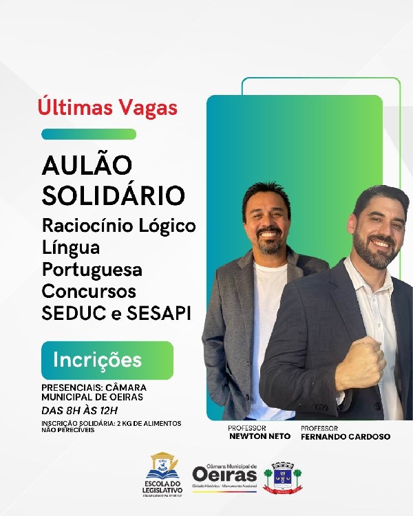 Promovido pela Escola do Legislativo da Câmara Municipal de Vereadores de Oeiras, o município de Oeiras está com as últimas vagas disponíveis para o Aulão Solidário voltado à preparação de candidatos aos concursos da Secretaria de Estado da Educação (SEDUC) e da Secretaria de Estado da Saúde (SESAPI). A iniciativa alia reforço educacional e ação social, ampliando o acesso à preparação para concursos públicos.